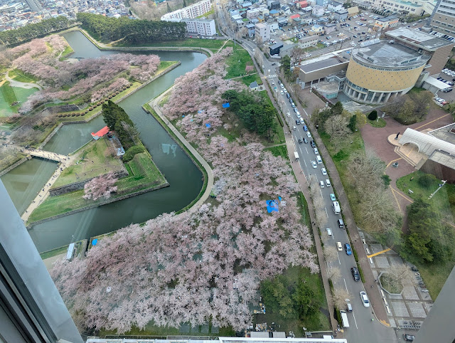 Next day we arrived early in Hakodate and what started out as brilliant sunshine soon became cold, overcast, and very very windy. Spoiled with another breakfast in our suite while port formalities occured then onto a bus to the Trapestine Convent. The grounds and buildings were not very exciting but the history and the determination of the missionaries was fascinating. Then on to enjoy the view from Goryokaku Tower where finally we saw a plethora of cherry blossom. Finally a walk around the star shaped fortress and a very swift tour of the Old Magistrate's Office. Again, very little in the way of funishings remained. Before returning to the ship we explored the Morning Markets where seafood was displayed for our inspection and selection. Huge crabs and abalone, scallops, fish, and many other seafoods both fresh and dried, however the only souvenir was a tiny (toy) fairy owl which has to be the cutest bird I ever did see.