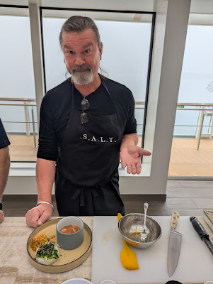 We enjoyed lunchtime pizza and in the afternoon joined a demonstration on Japanese cooking. All the hard work was done by Matt as by that time I was feeling the effects of the swell. Luckily there is plenty of dramamine on board and I was recovered enough to frock up for the formal dinner.